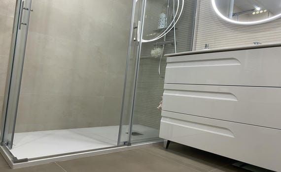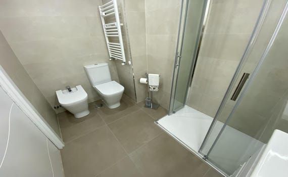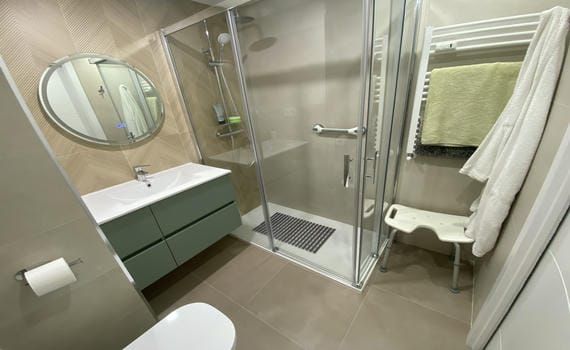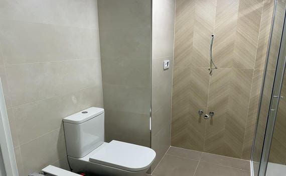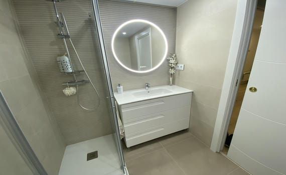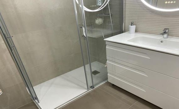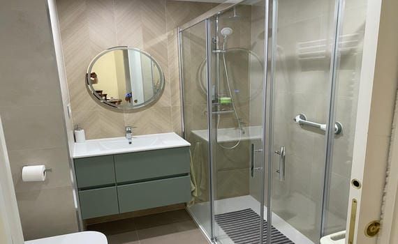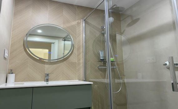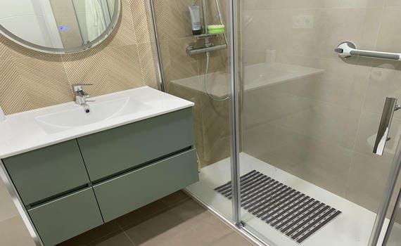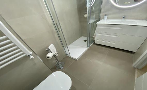 Con los revestimientos terminados, se instala el mueble suspendido a la altura acordada, verificando aplomado y fijaciones. Se colocan lavabo, válvulas, sifones y el sanitario compacto, cuidando distancias de uso y accesos de mantenimiento. En la ducha se monta grifería —preferentemente termostática— a la altura adecuada y se instala la mampara fija de vidrio templado, ajustando perfilerías y sellados para garantizar estanqueidad. La iluminación LED se completa con un punto de espejo que evite sombras. Todo se prueba y se regula para un uso cómodo y eficiente en la reforma de cuartos de baño en Aluche.